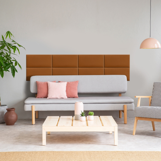 Bringe mit unserem gepolsterten Wandpaneel in Honigfarbe ein Stück Behaglichkeit und Eleganz in dein Zuhause.