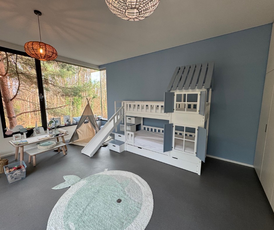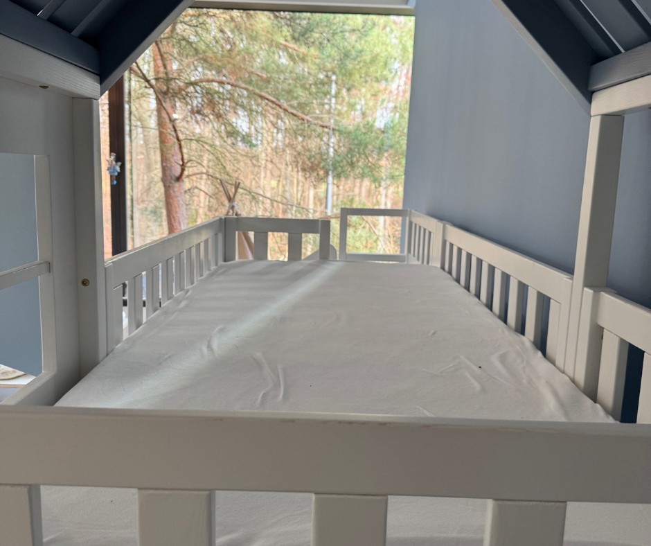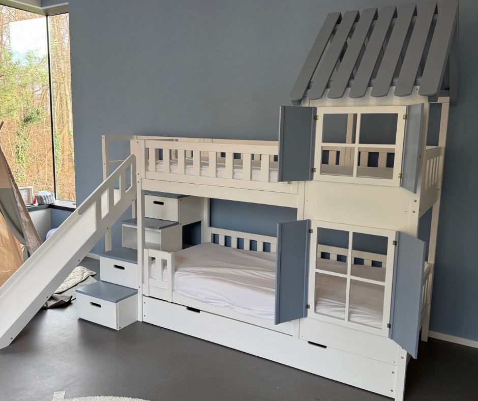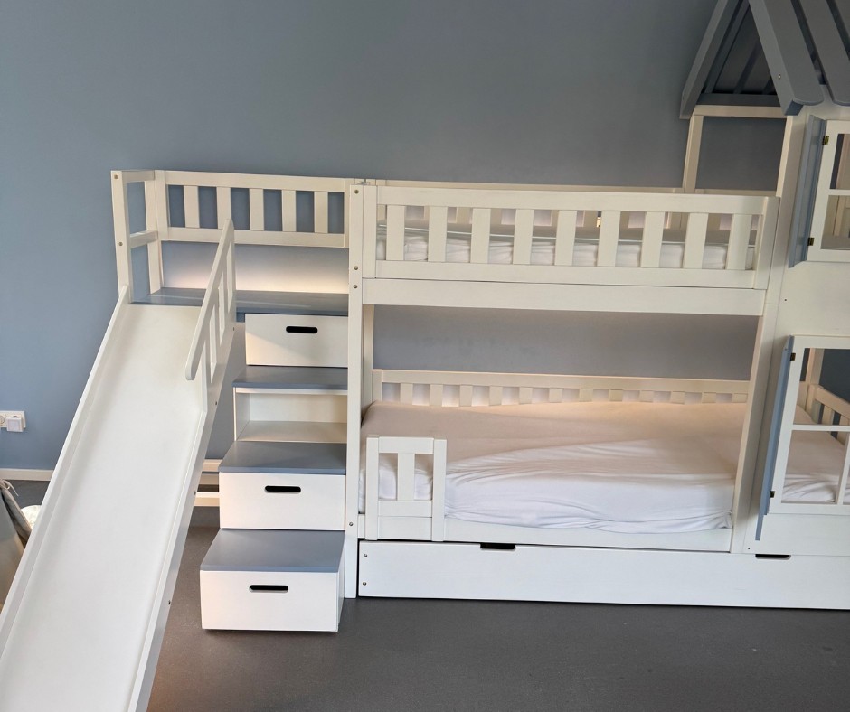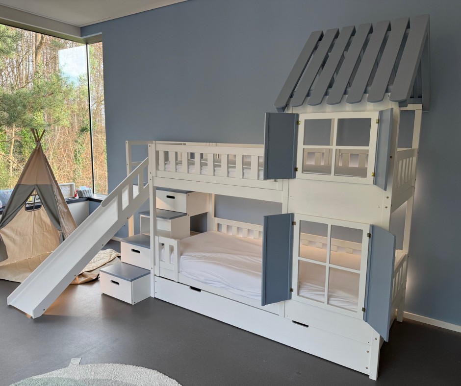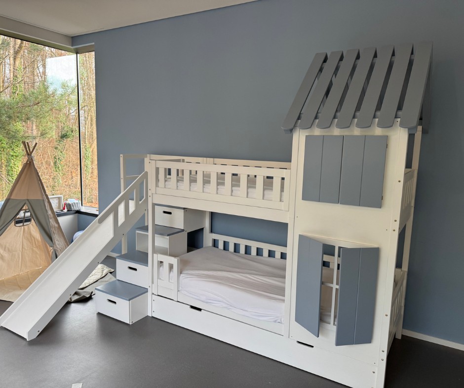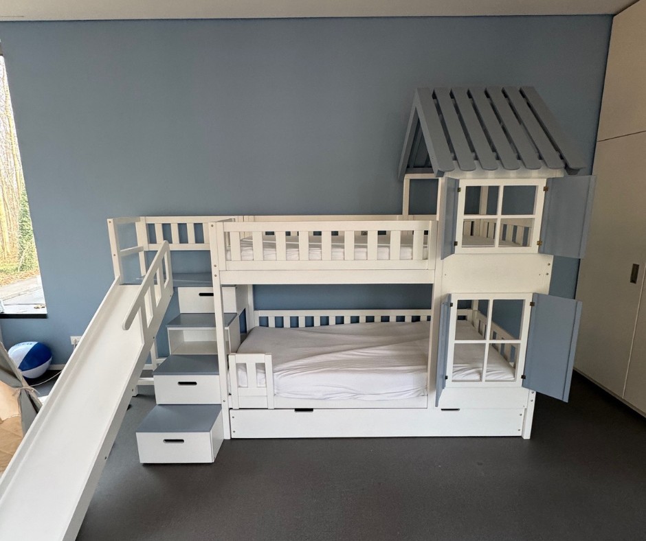 Im Vergleich zu einem herkömmlichen Hochbett, Stockbett oder Doppelstockbett bietet diese Sonderanfertigung deutlich mehr Möglichkeiten. Die integrierte Treppe sorgt für einen sicheren und komfortablen Aufstieg, während das Dach dem Bett den Charakter eines gemütlichen Hausbetts verleiht. Die Rutsche bringt Bewegung in den Alltag und macht das Aufstehen am Morgen zu einem positiven Erlebnis.