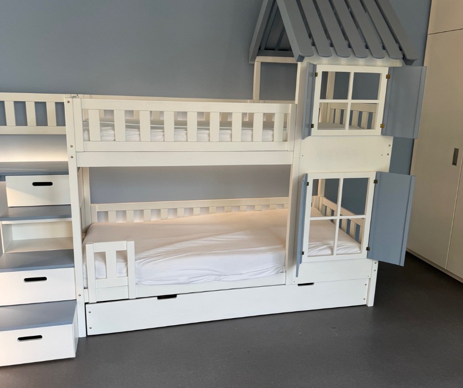 Ein maßgefertigtes Etagenbett mit Treppe, Dach und Rutsche wird aus stabilen Materialien gefertigt und ist für den täglichen Gebrauch ausgelegt. Breite Stufen, stabile Geländer und eine durchdachte Konstruktion sorgen dafür, dass Kinder sich sicher bewegen können. Die solide Bauweise reduziert Schwingungen und bietet ruhigen Schlaf – ein wichtiger Faktor für Eltern, die auf Qualität und Sicherheit achten.
