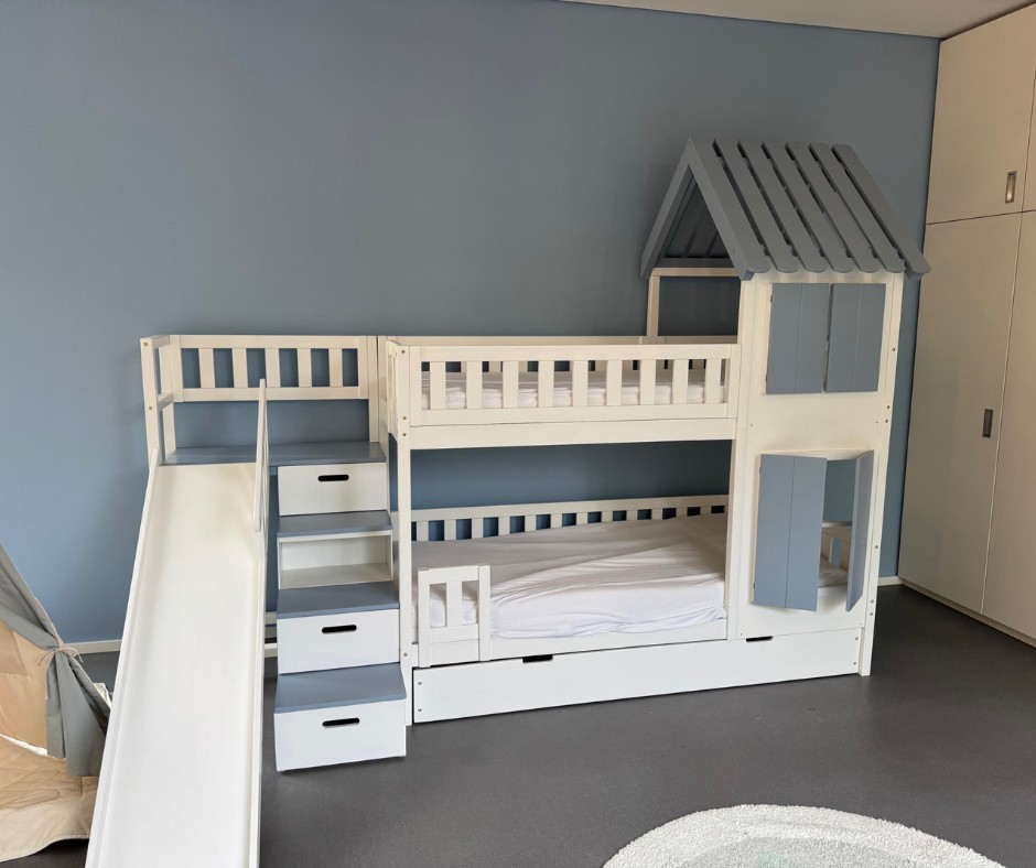 Ein Etagenbett mit Treppe, Dach und Rutsche – Sonderanfertigung ist die ideale Wahl für Familien, die ein sicheres, langlebiges und kindgerechtes Möbel suchen. Es vereint die Vorteile eines Hochbetts, Stockbetts und Hausbetts in einem individuellen Design. Dieses Etagenbett wächst mit dem Kind mit und bleibt über viele Jahre hinweg funktional, attraktiv und wertvoll.