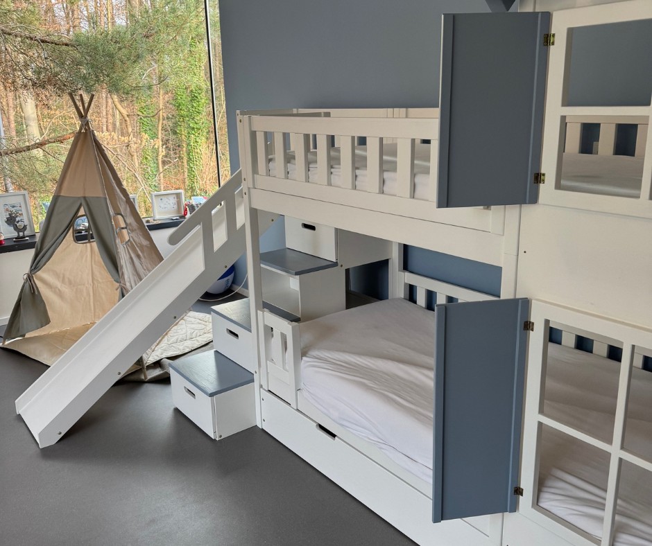 Ein Etagenbett mit Treppe, Dach und Rutsche – Sonderanfertigung ist eine außergewöhnliche Lösung für Familien, die Wert auf Sicherheit, Individualität und Funktionalität legen. Dieses besondere Etagenbett verbindet komfortables Schlafen mit Spiel und Bewegung und schafft im Kinderzimmer eine Umgebung, die zum Wohlfühlen einlädt. Als maßgefertigtes Möbelstück passt es sich optimal an Raumgröße, Bedürfnisse und Alter des Kindes an.