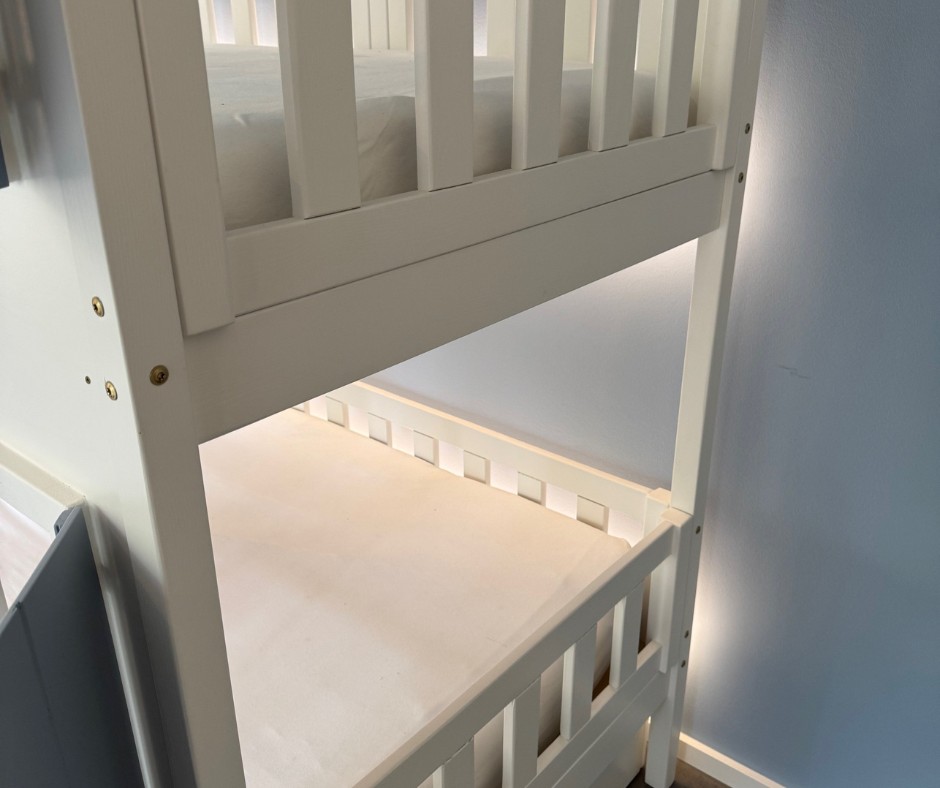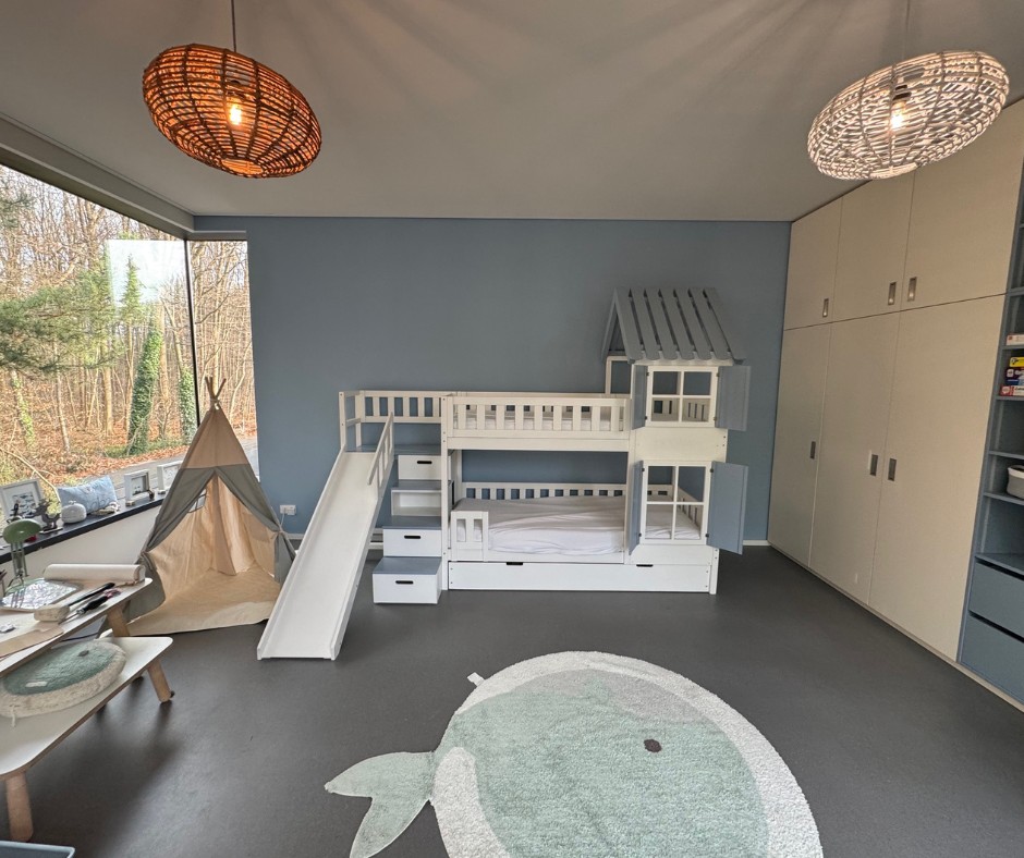 Als Sonderanfertigung lässt sich dieses Etagenbett perfekt an die räumlichen Gegebenheiten anpassen. Ob kleines Kinderzimmer oder großzügiger Raum – das Bett nutzt die Höhe optimal aus und schafft zusätzliche Fläche zum Spielen, Lernen oder Entspannen. Damit ist es nicht nur ein Schlafplatz, sondern ein funktionales Zentrum des Kinderzimmers.