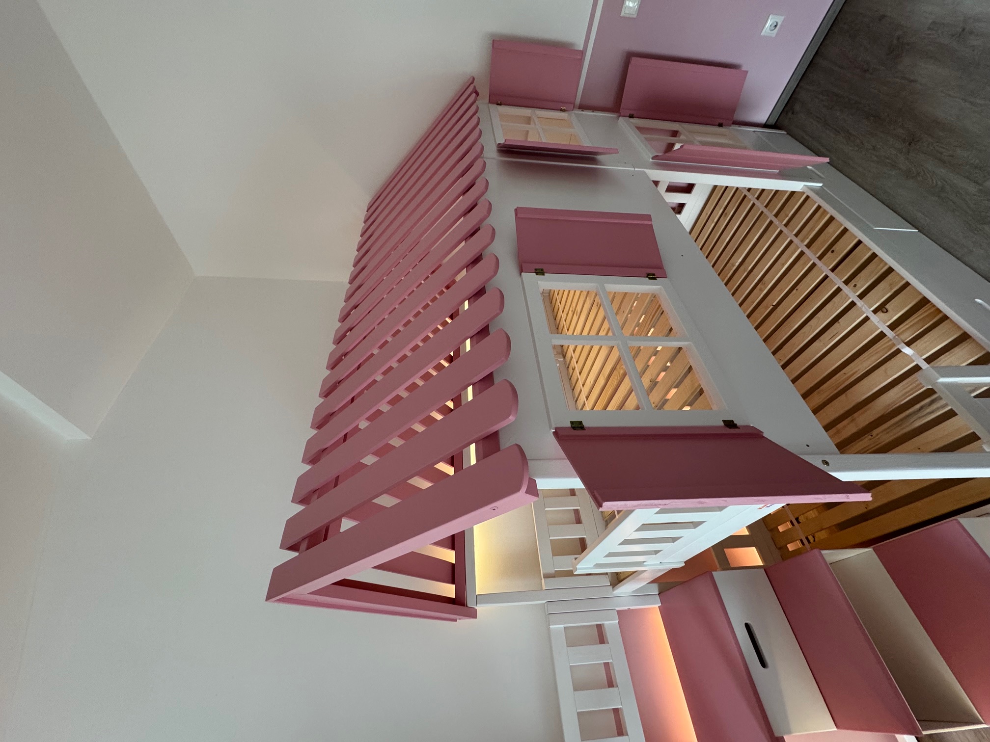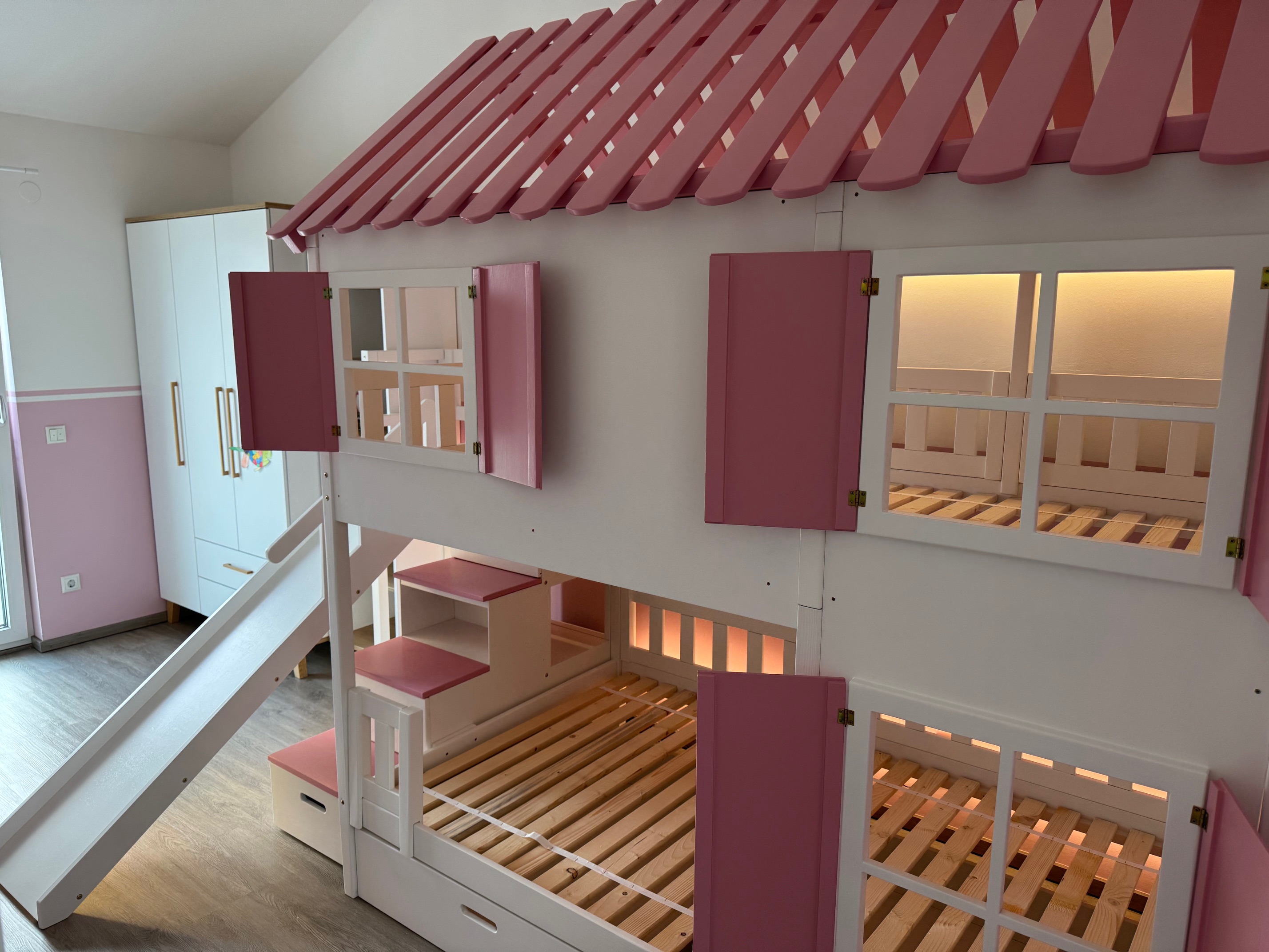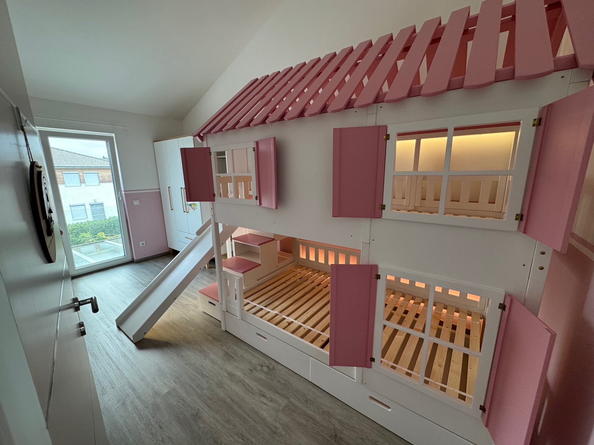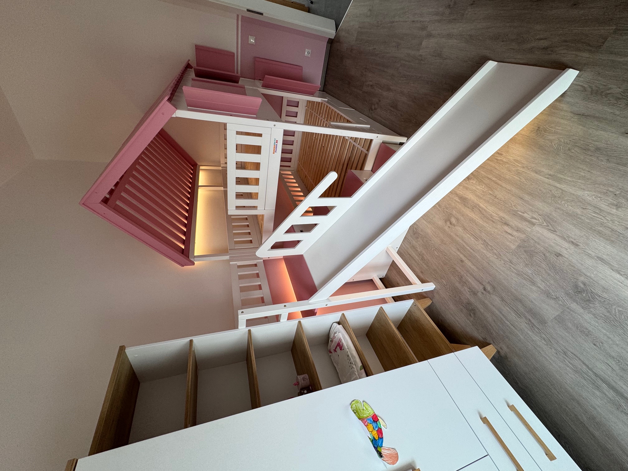 Stabiles Stockbett 120x200 mit Treppe und Rutsche, LED-Licht und kindersicherem Design für Familien in Österreich.