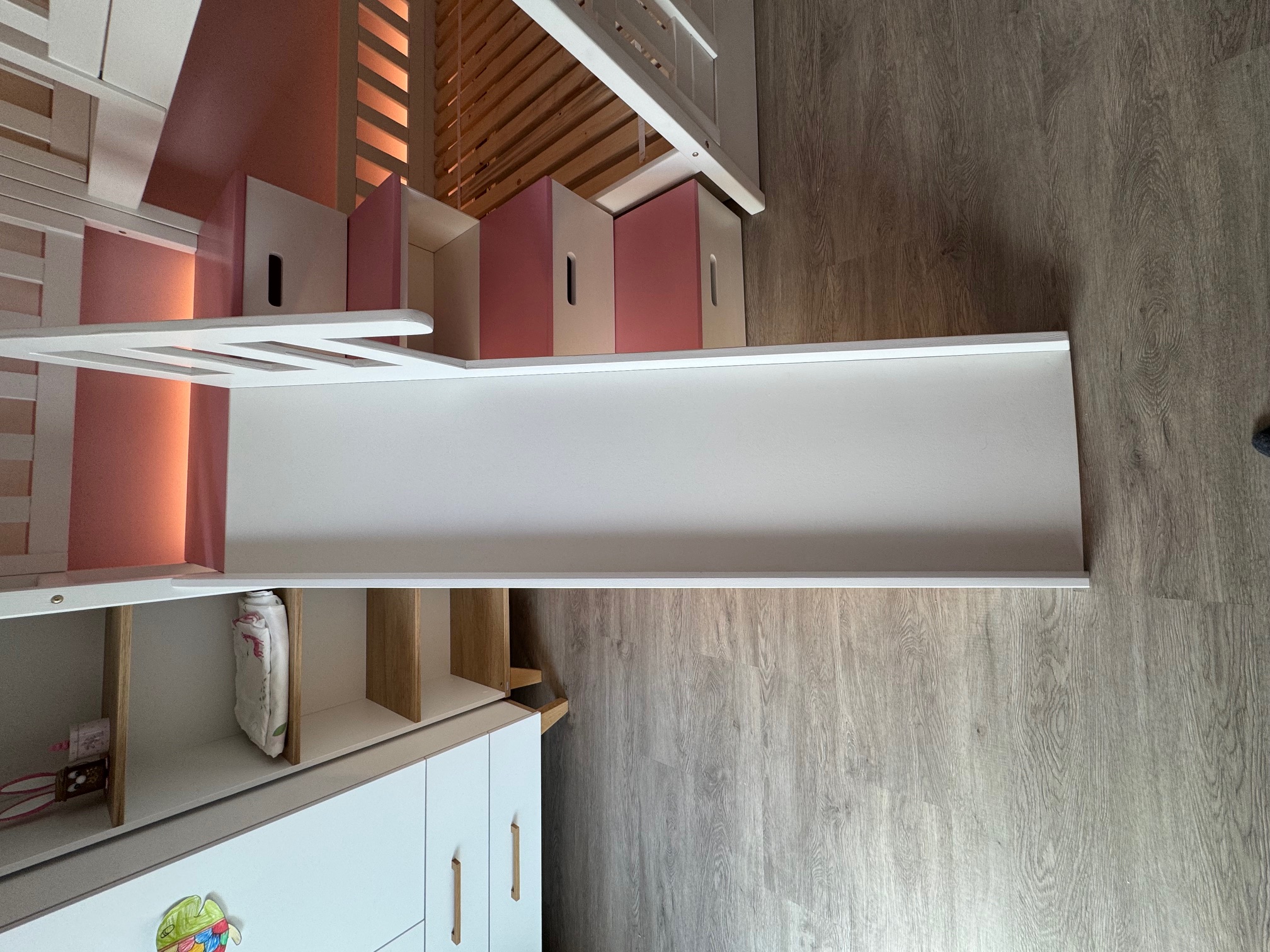 Etagenbett mit LED-Beleuchtung, Rutsche und Treppe – ein sicheres Kinderbett 120x200 aus Österreich.  Stabiles Stockbett 120x200 mit Treppe und Rutsche, LED-Licht und kindersicherem Design für Familien in Österreich.