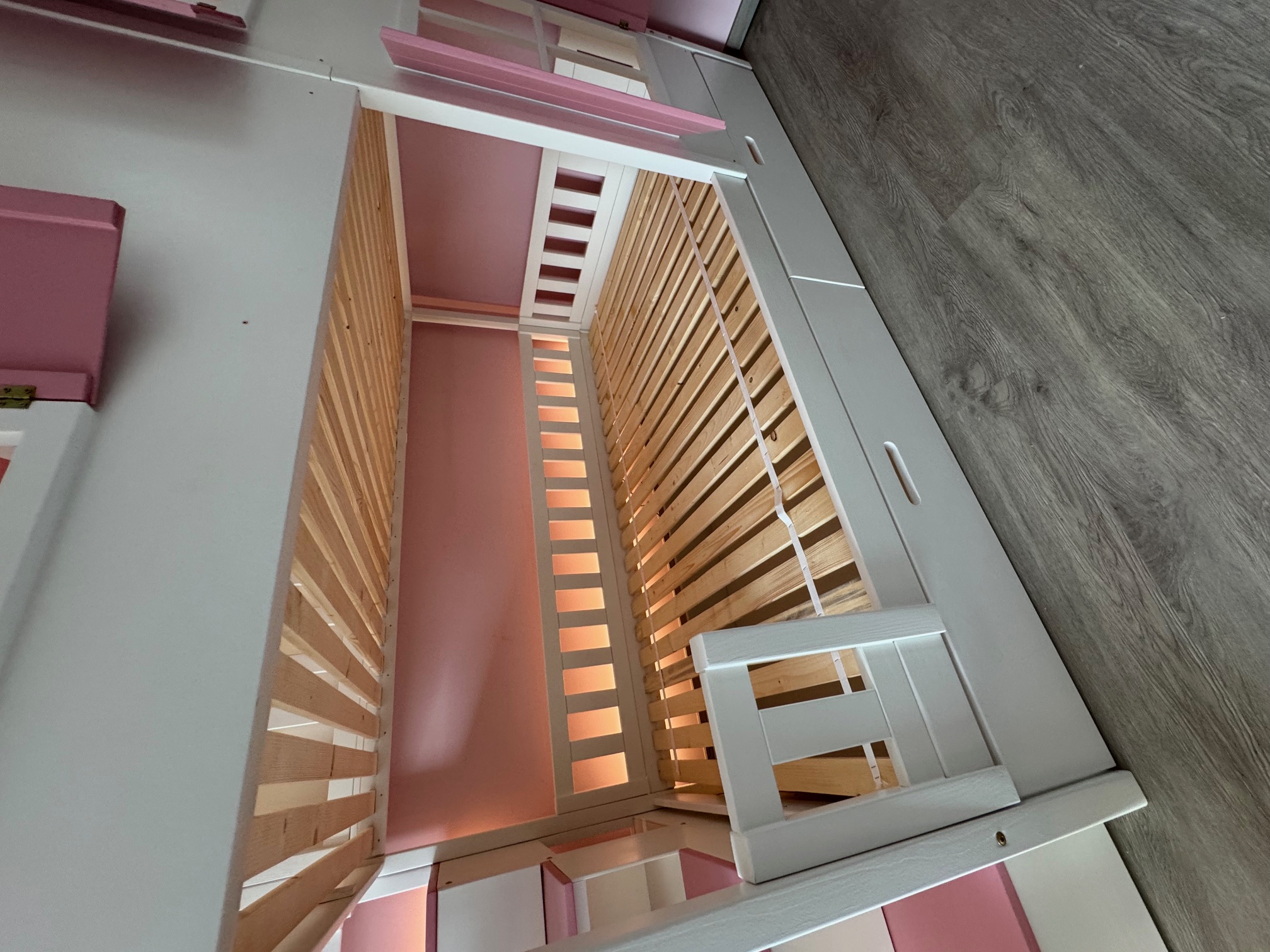 LED-beleuchtetes Etagenbett 120x200 mit Treppe und Rutsche – perfektes Kinderbett in Österreich.