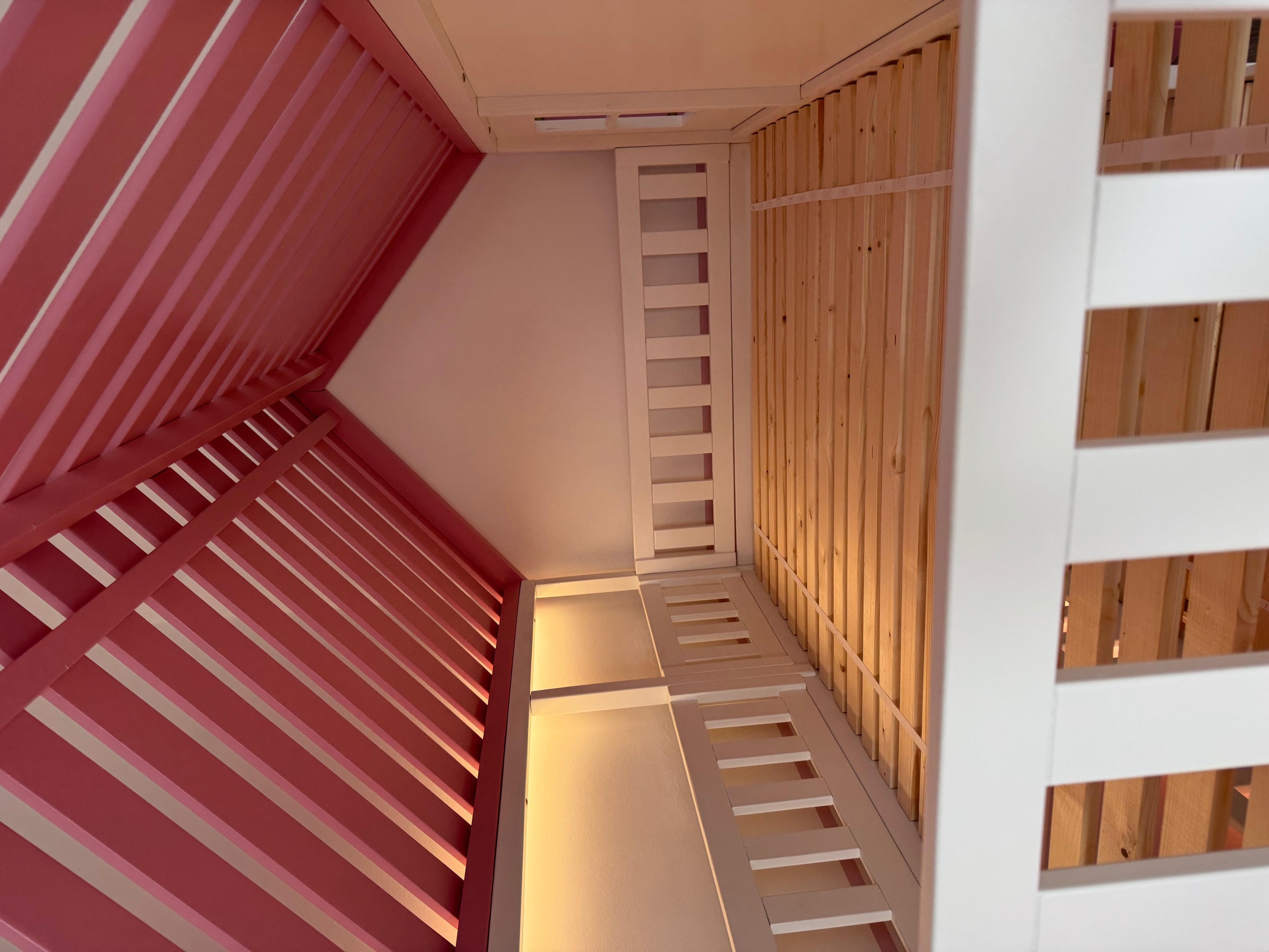 Stockbett 120x200 aus Österreich mit Rutsche, Treppe und modernen LED-Lichtern – kindersicher und funktional.