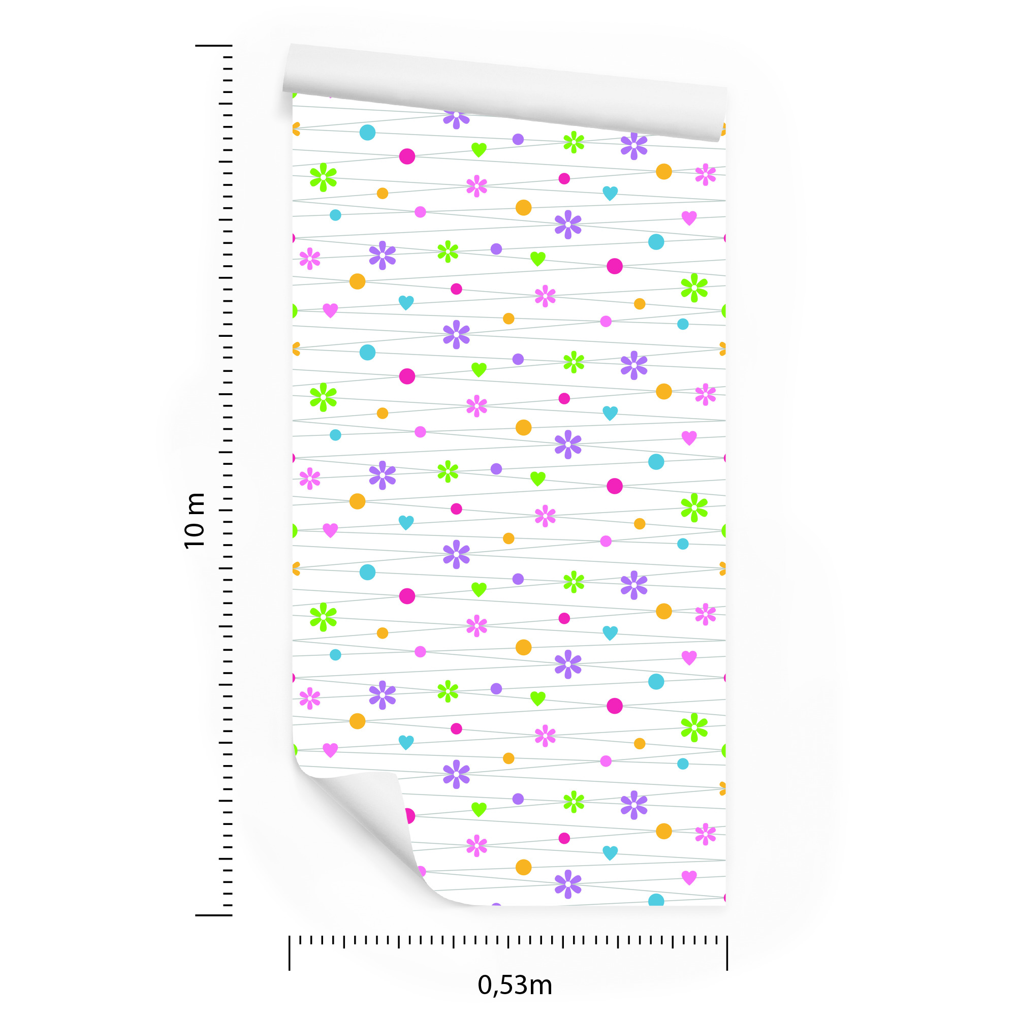 Tapete für Kinder – bunte Blumen, Herzen und Punkte, 1 Rolle