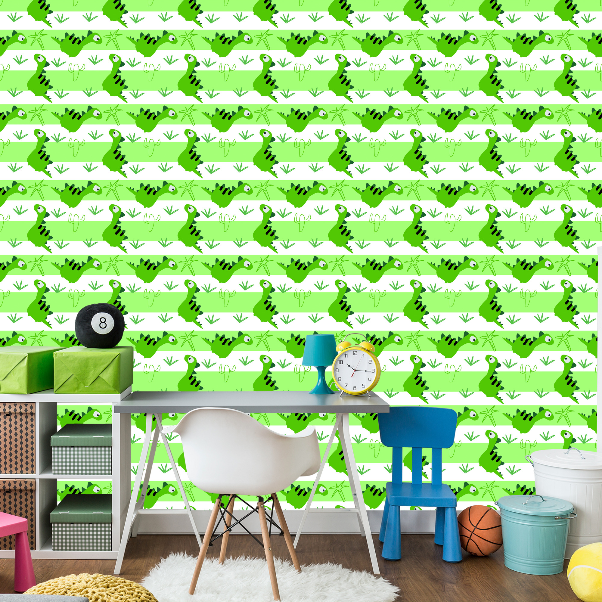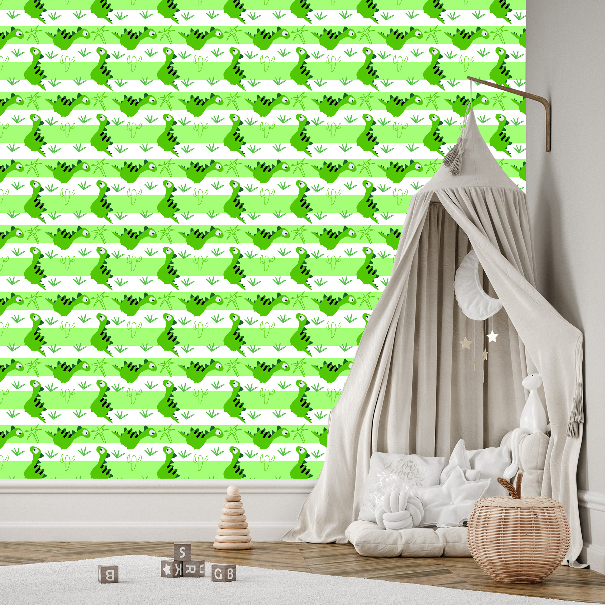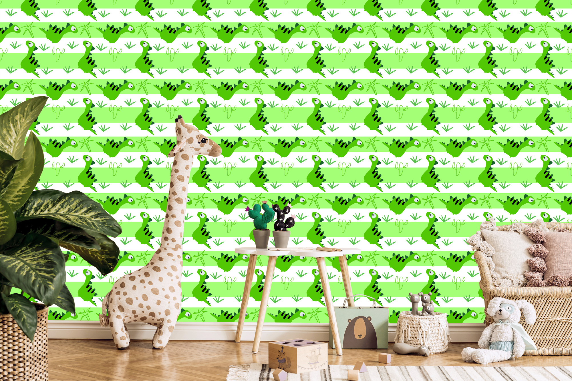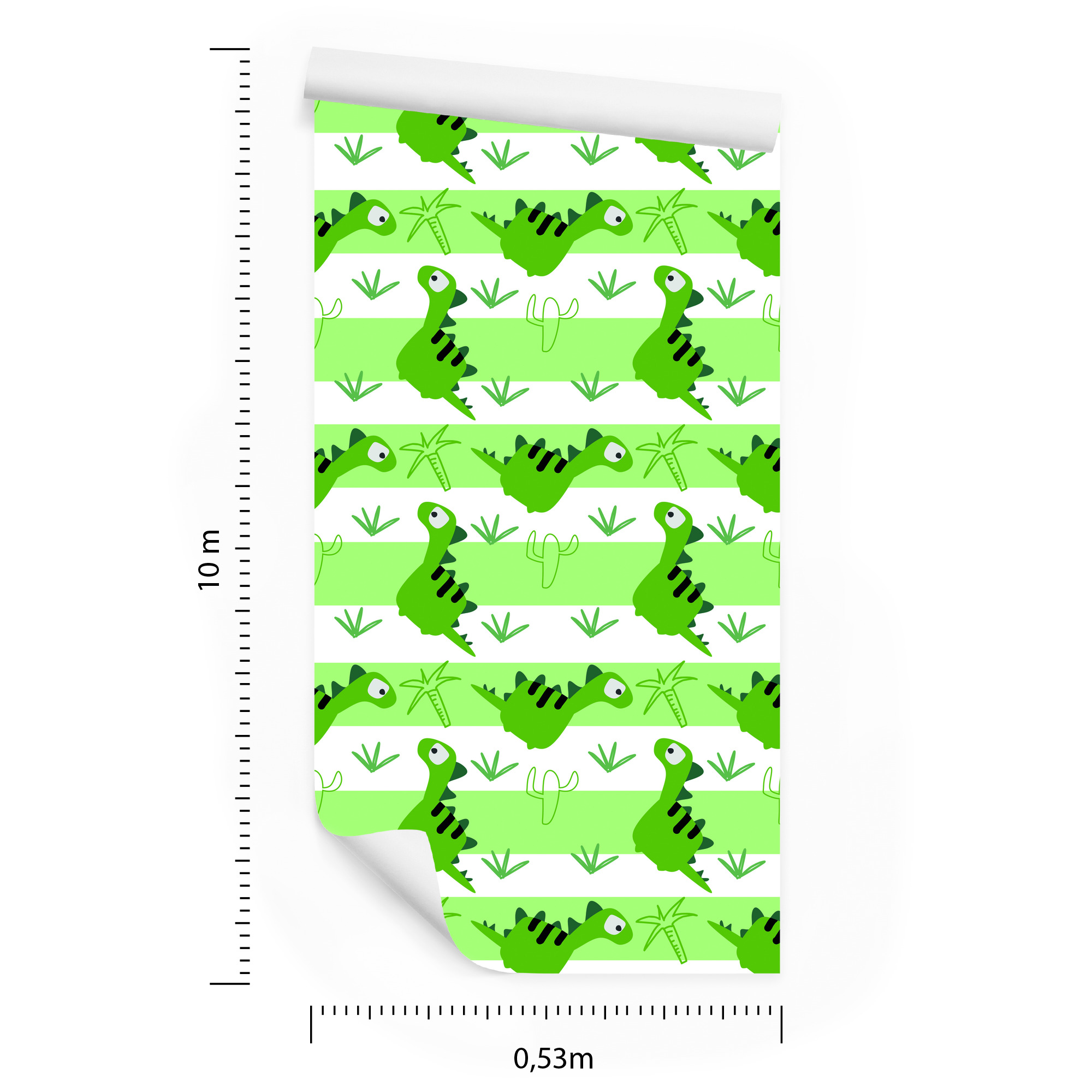 Tapete für Kinder – Dinosaurier auf grün-weißem Streifenhintergrund 1 Rolle