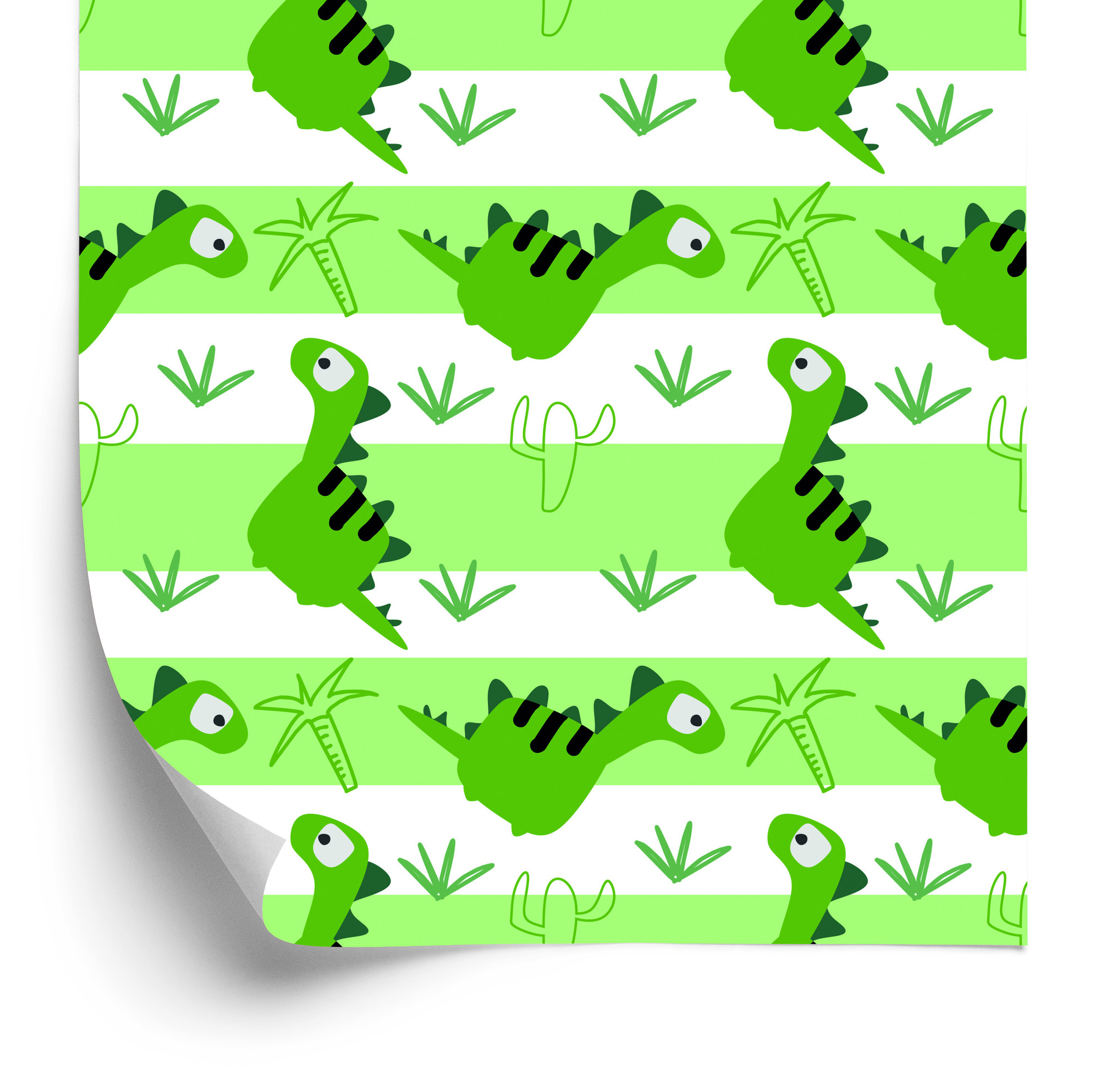 Main Page » Tapeten fürs Kinderzimmer » Tapete für Kinder – Dinosaurier auf grün-weißem Streifenhintergrund 1 Rolle