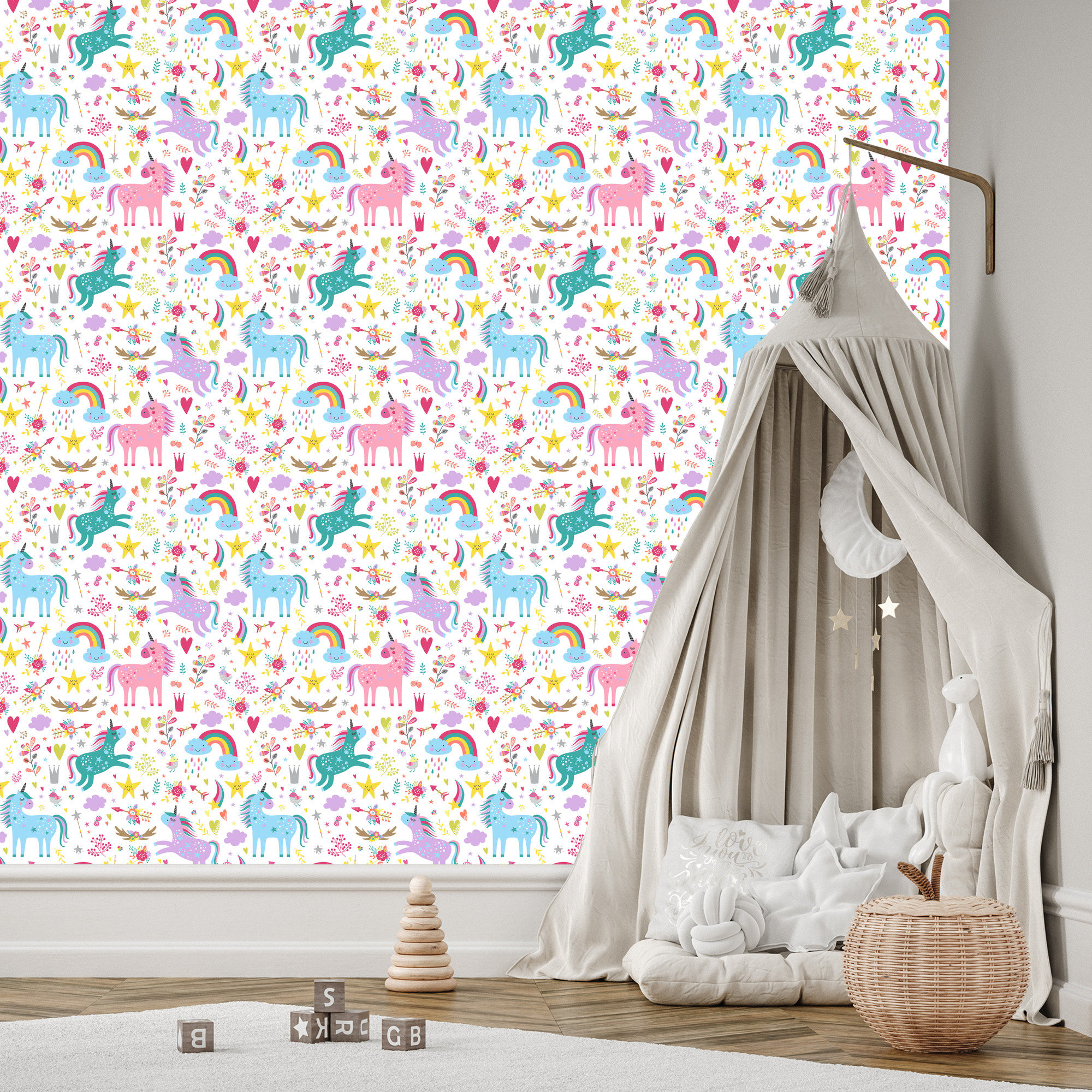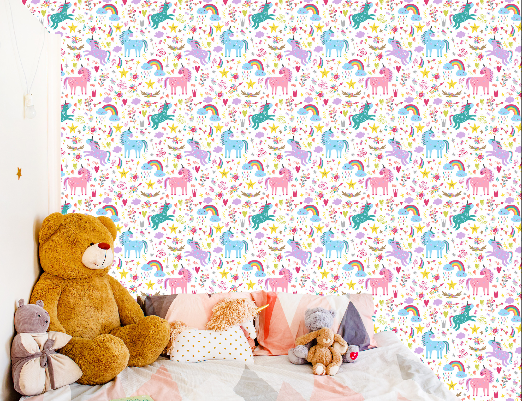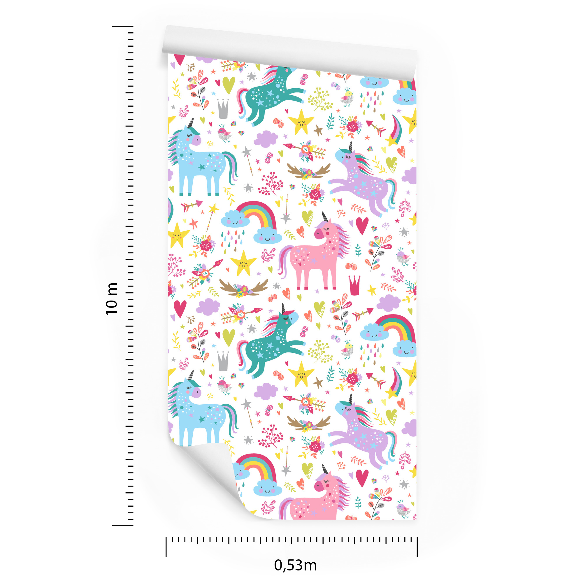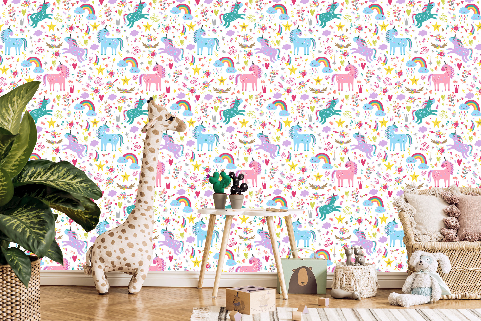 Tapete für Kinder – Regenbogen-Einhörner im skandinavischen Stil