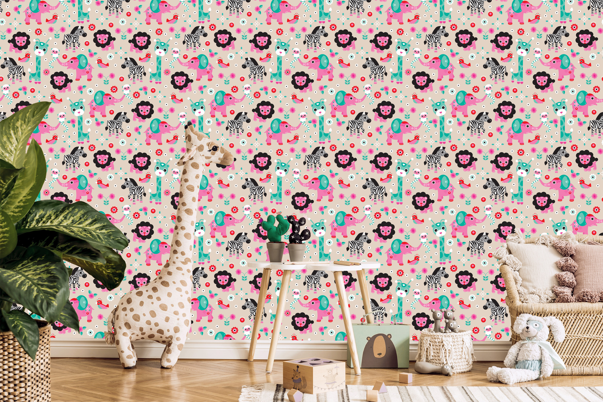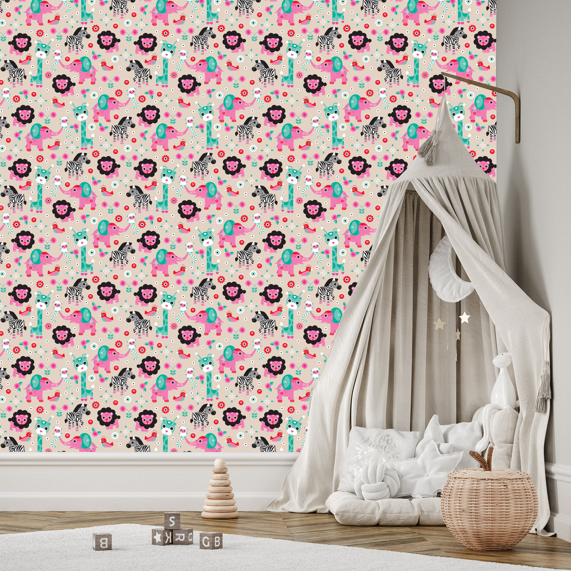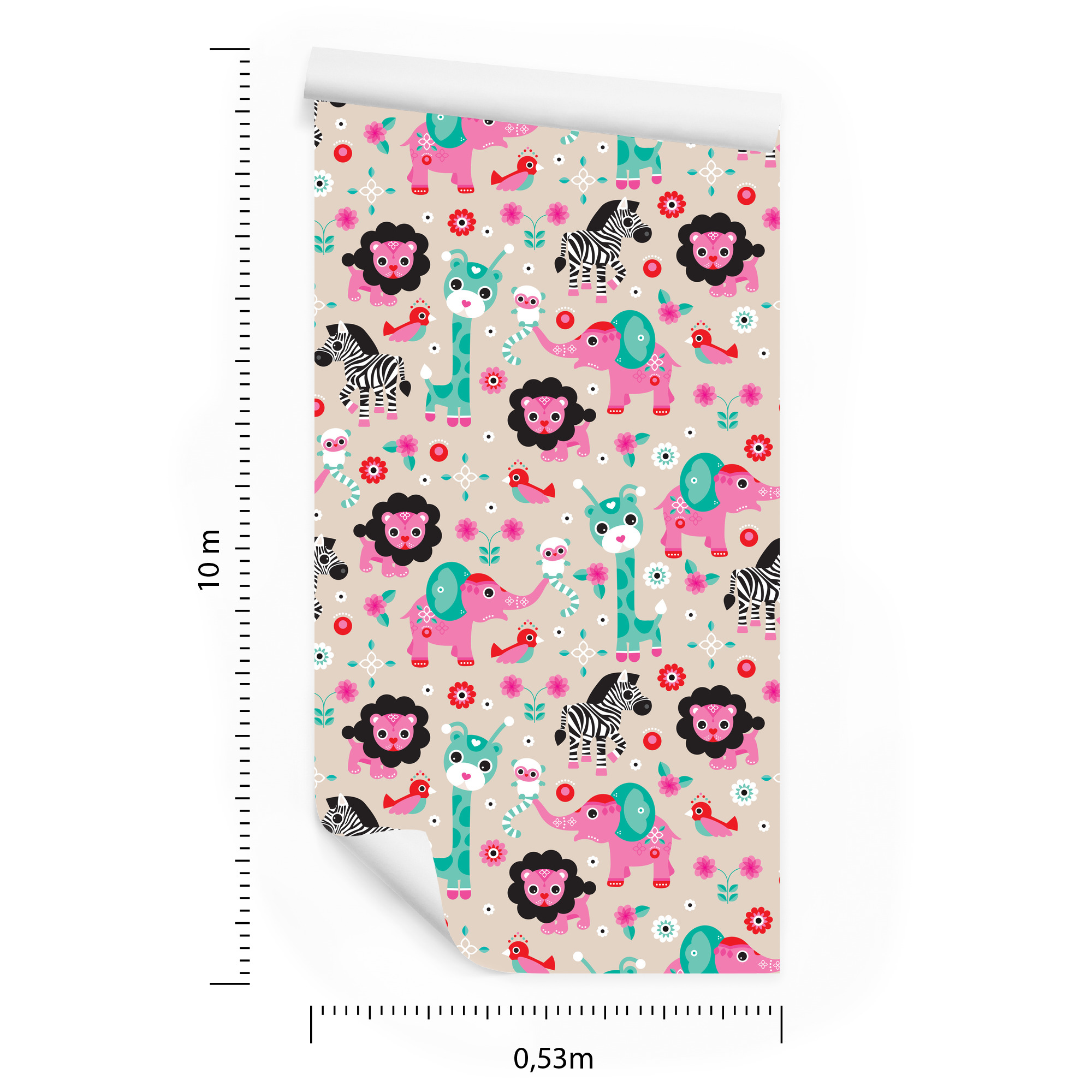 Tapete für Mädchen, Safari, Zebras, Löwen, Elefanten 1 Rolle