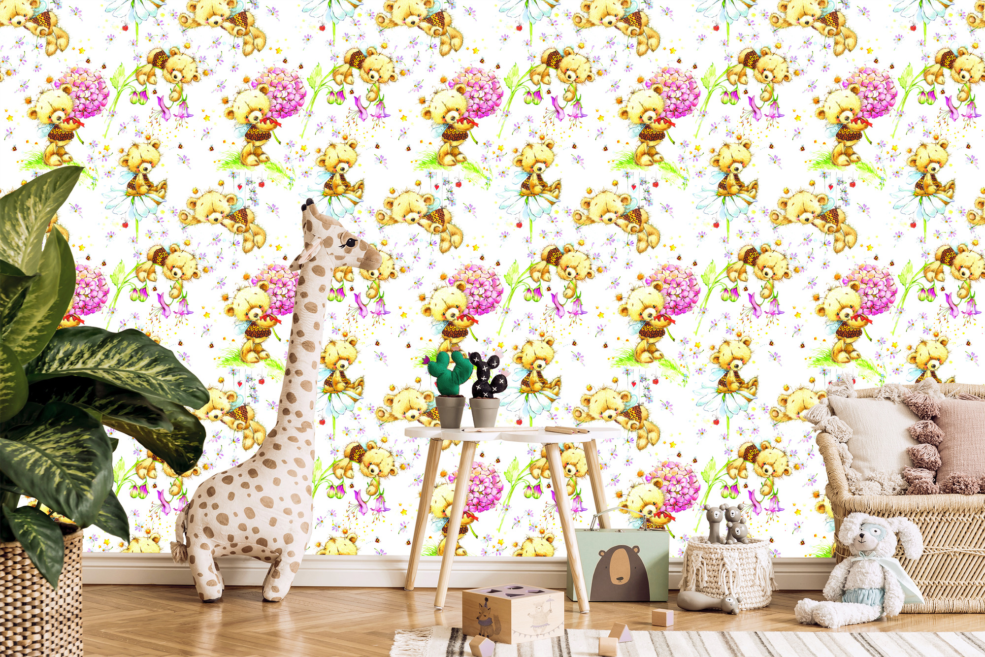 Tapete für Mädchen Teddybären Blumen Pflanzen Blätter, 1 Rolle