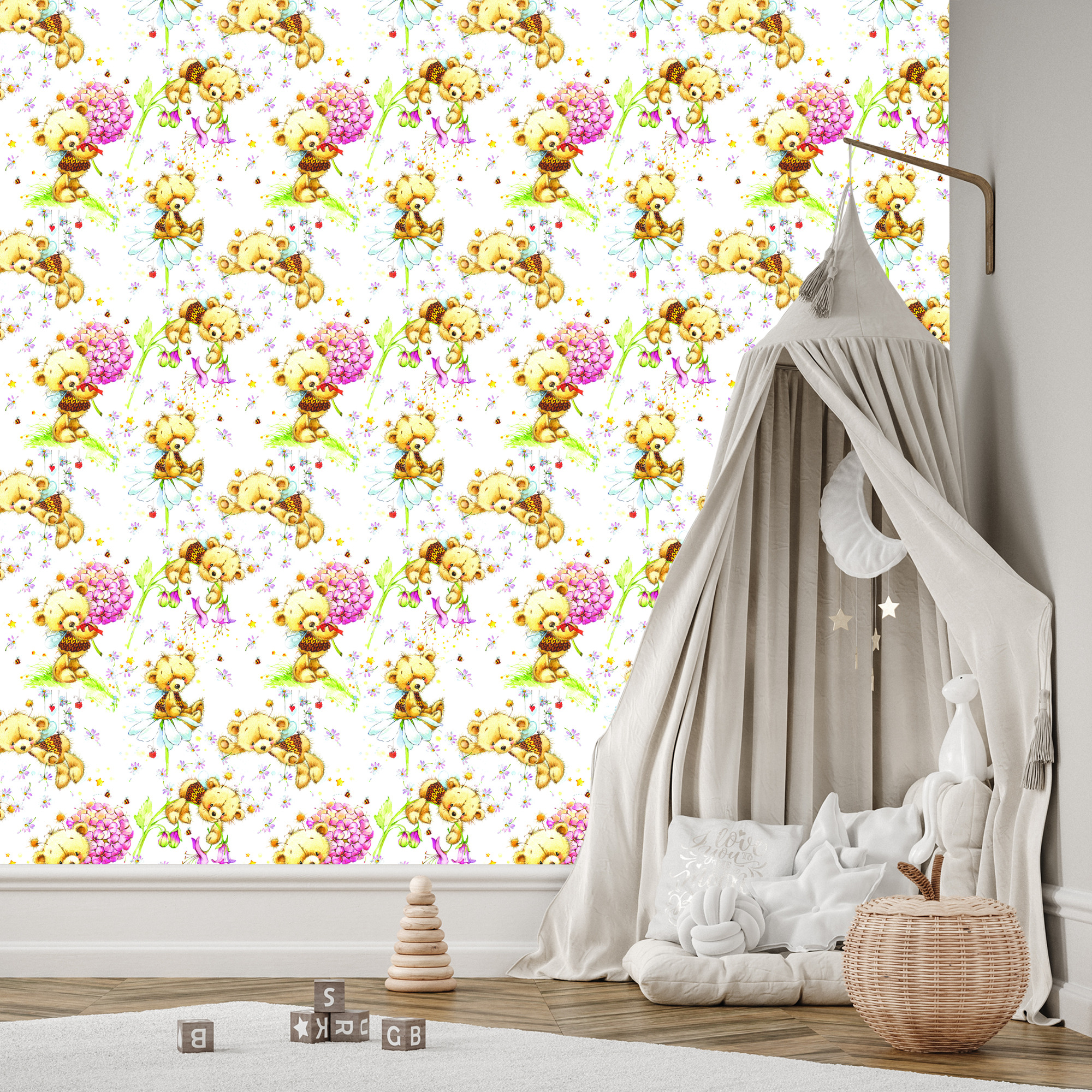 Main Page » Tapeten fürs Kinderzimmer » Tapete für Mädchen Teddybären Blumen Pflanzen Blätter, 1 Rolle