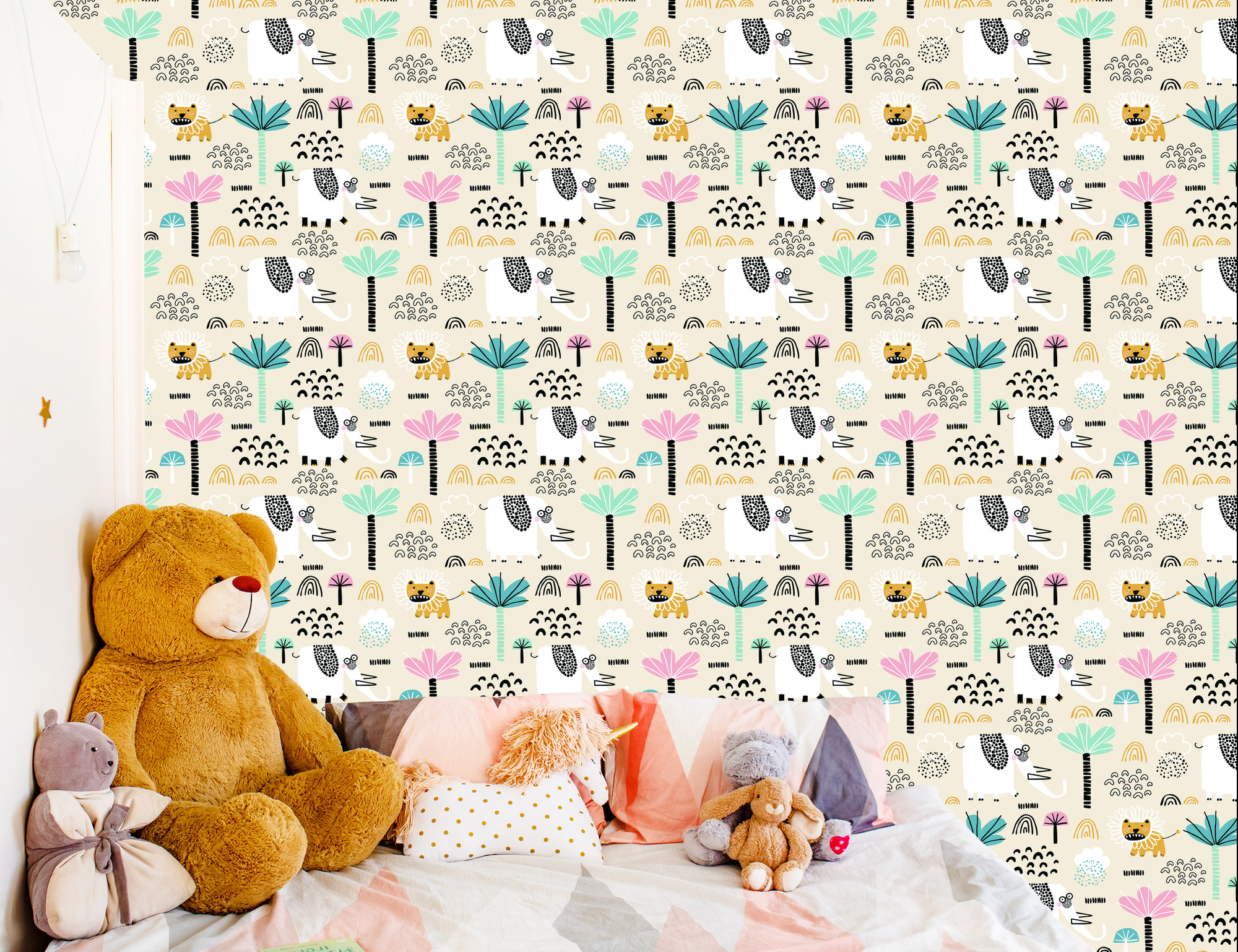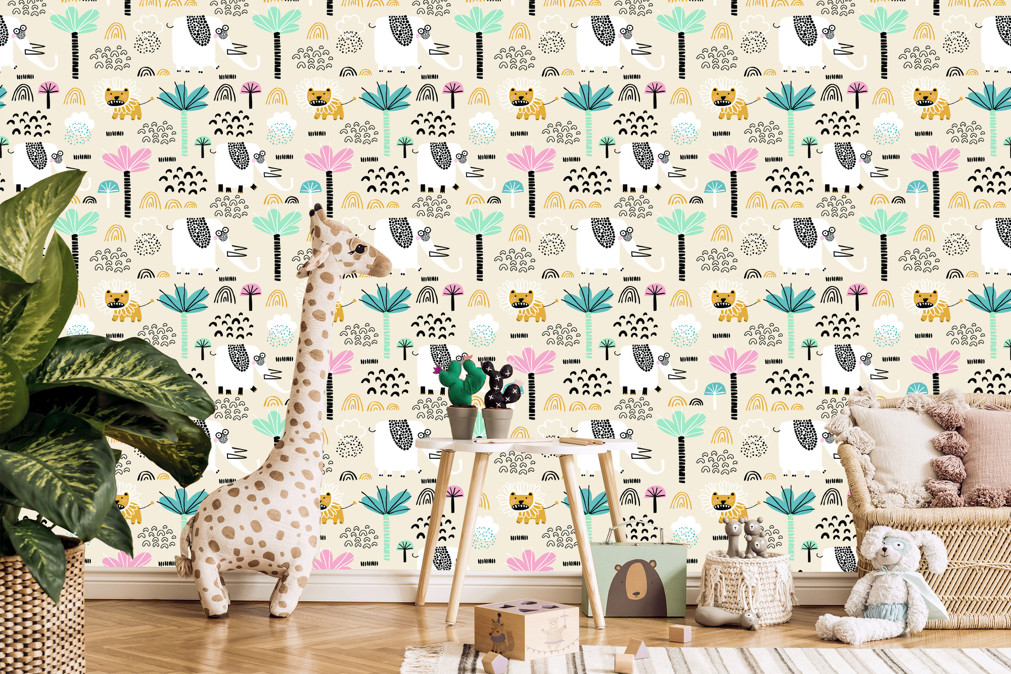 Main Page » Tapeten fürs Kinderzimmer » Tapete Safari Löwen Pastellbäume, Jungenzimmer, 1 Rolle